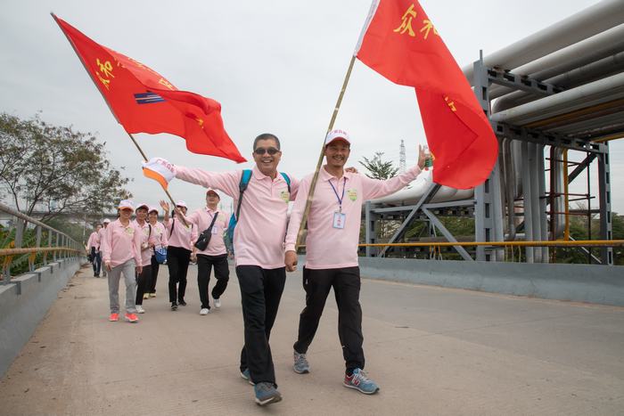 在启动仪式上,21支徒步方队的队员服装整齐,昂首挺胸,神采飞扬。公司工会主席于素洁发表了热情洋溢的讲话,她说,公司已经成功举办了三届健康徒步活动,受到越来越多职工和家属们的喜爱,充分体现了公司强大的感召力和凝聚力!人们在徒步过程中既共建了“人和家和,幸福众和”大家庭的快乐,又共享了“好心茂名,平安茂名”文明城市的成果。
