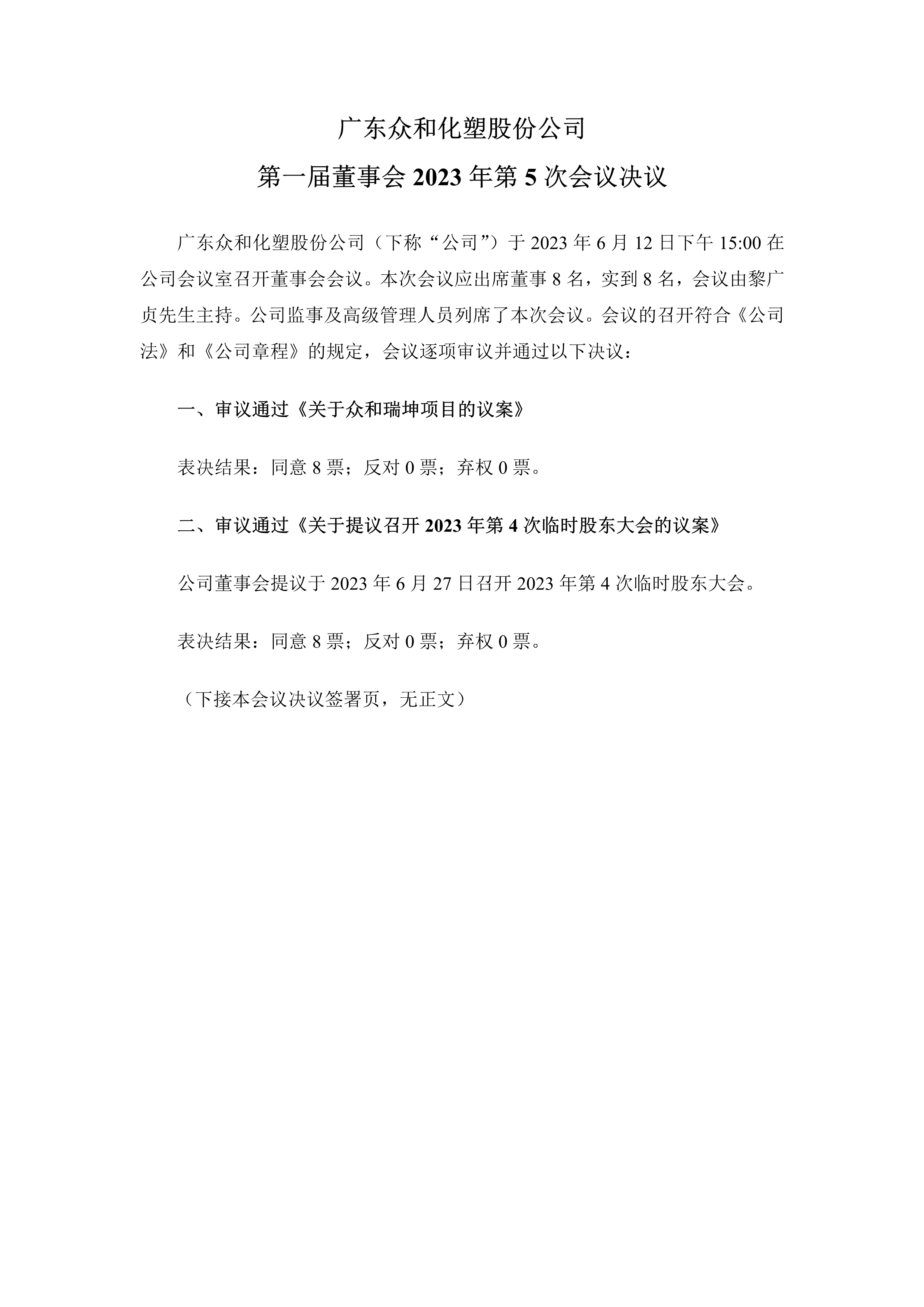 16877太阳集团 第一届董事会2023年第5次会议决议