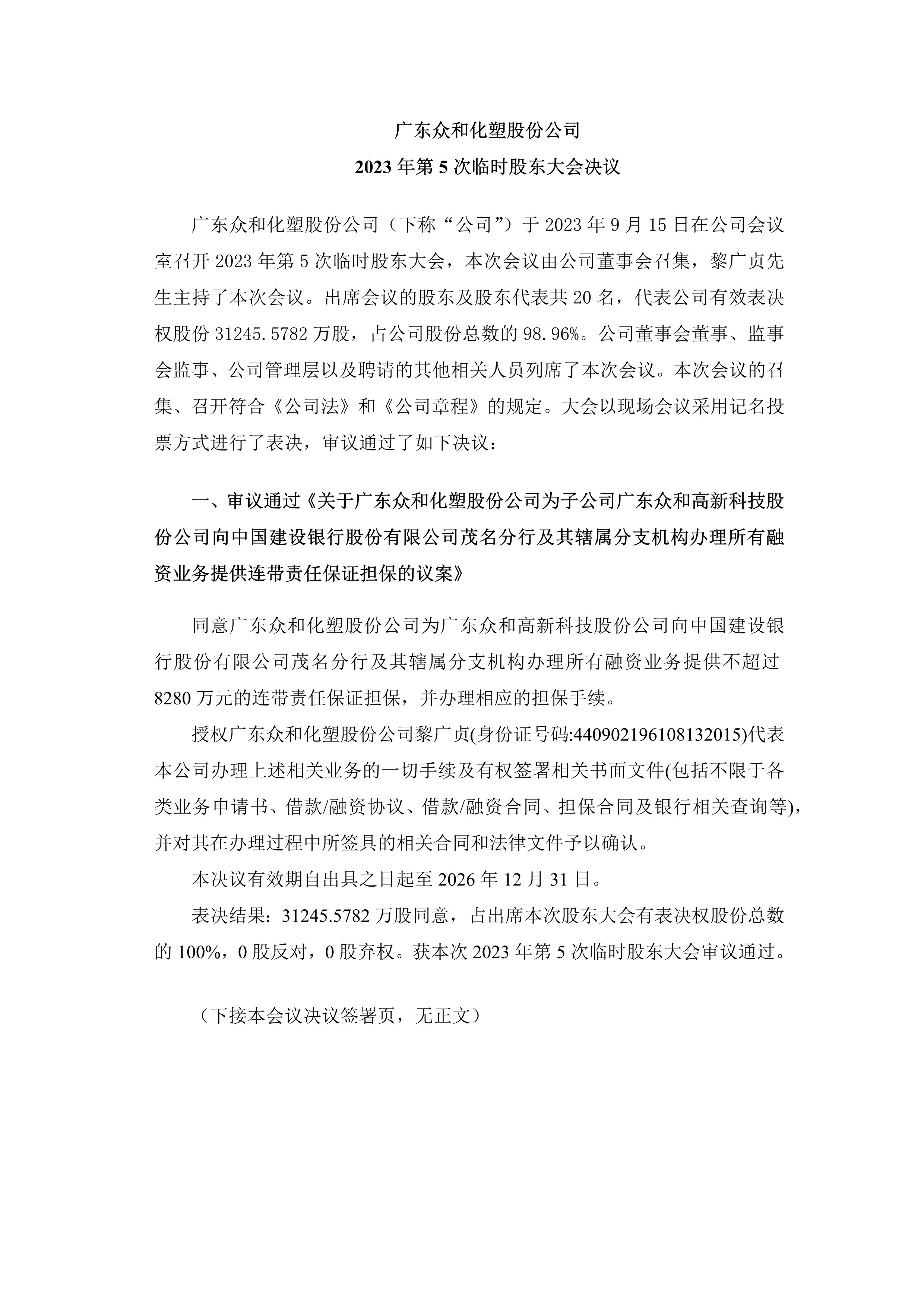 16877太阳集团 2023年第5次临时股东大会决议