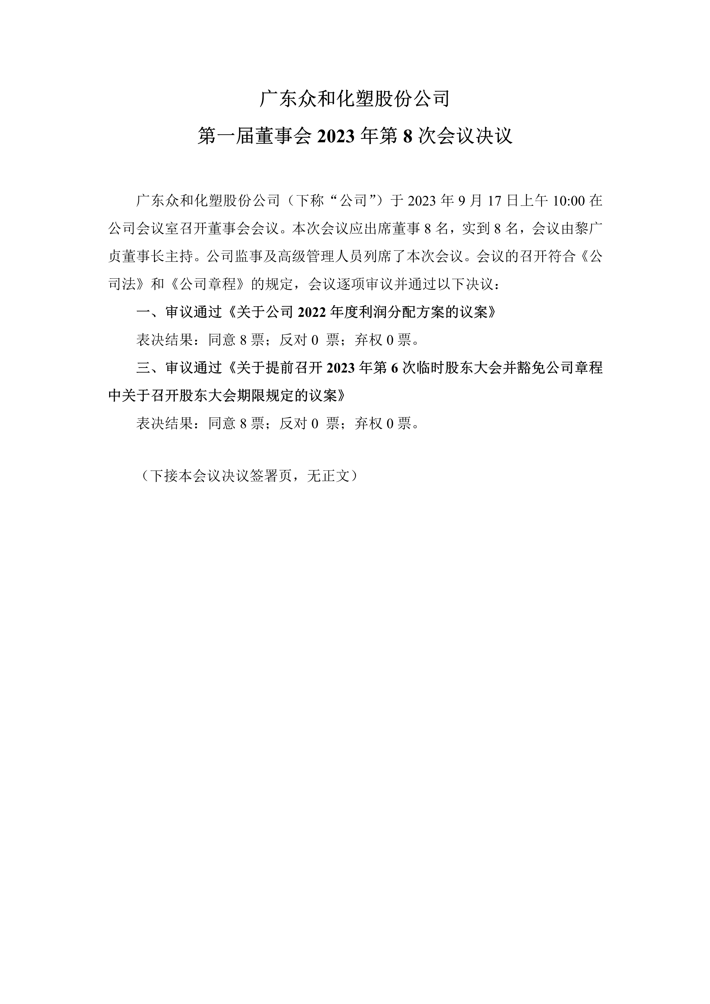 16877太阳集团 第一届董事会2023年第8次会议决议