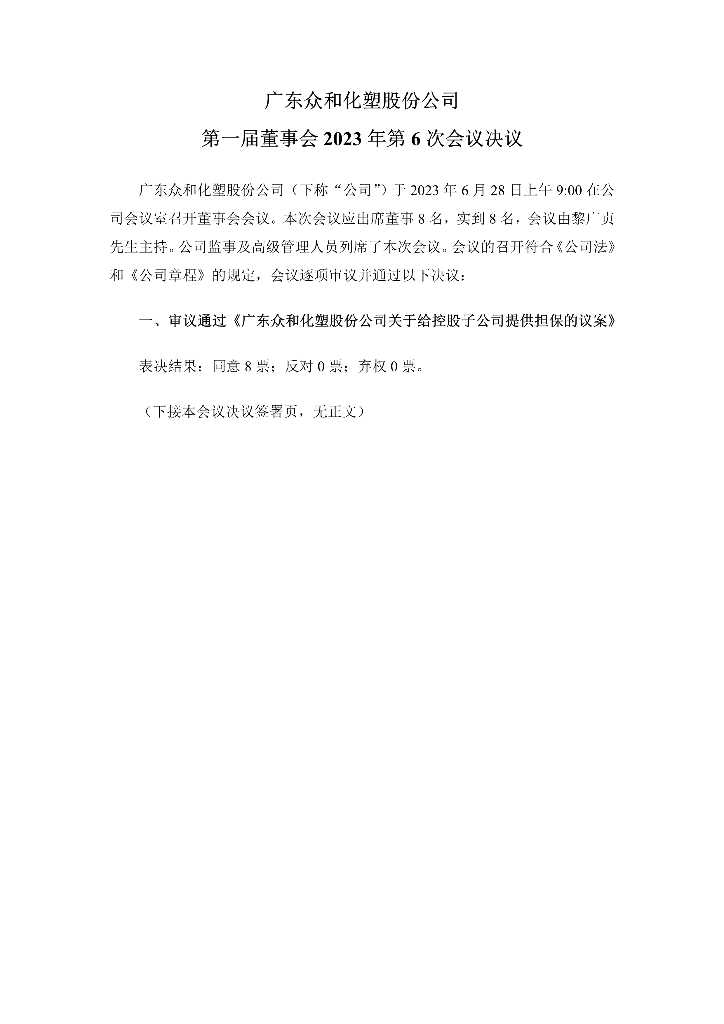 16877太阳集团 第一届董事会2023年第6次会议决议